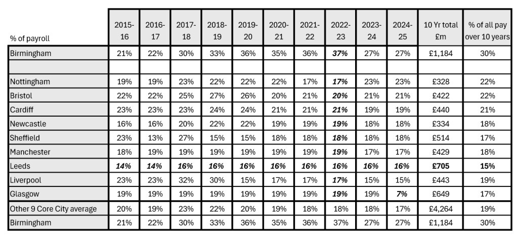 It was literally an extraordinary ask. Birmingham City Council was the only one of the 10 Core City councils in the UK required to pay so much in percentage terms on top of its basic total pay bill. None of the others came anywhere near it.