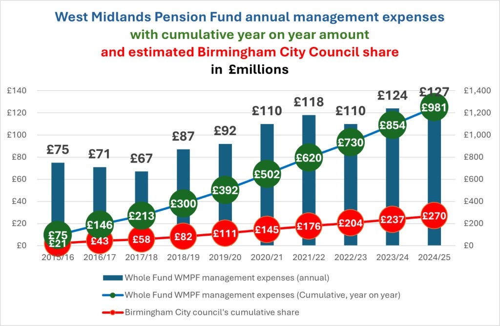 On the basis that Birmingham City Council pays around 28% of WMPF'S administration expenses, we can estimate that Birmingham effectively became responsible for paying £270 million of those management expenses.