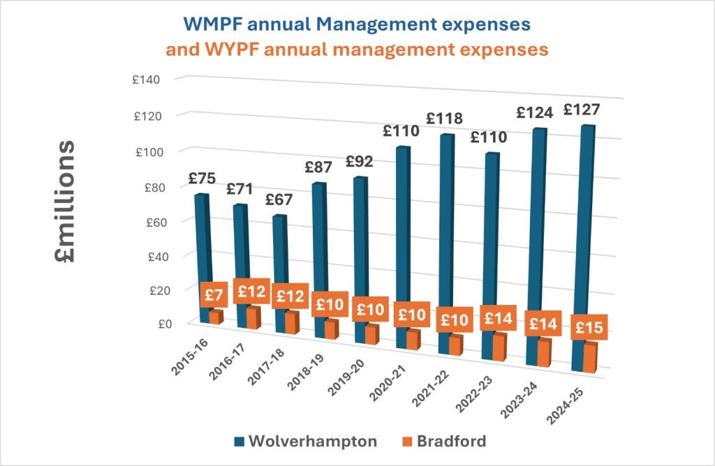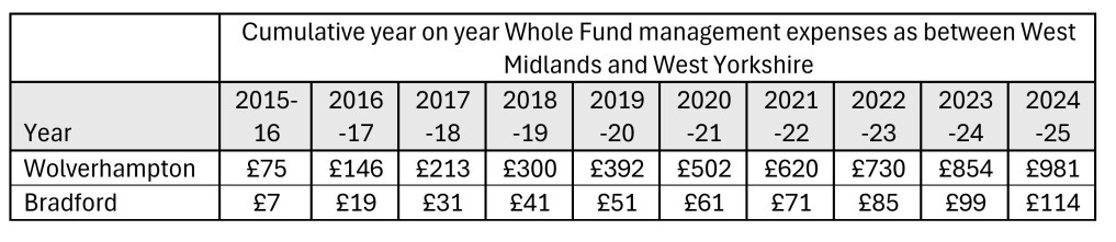 Helpfully also, are the facts that employee contributions in the West Midlands in 2016 were £110.1m, and employee contributions in West Yorkshire were £110.0m. So a highly directly-comparable fund. Like WMPF it has a big city in it – Leeds (the UK's second biggest local council after Birmingham). As WMPF is run by Wolverhampton City Council, so WYPF is run by Bradford City Council