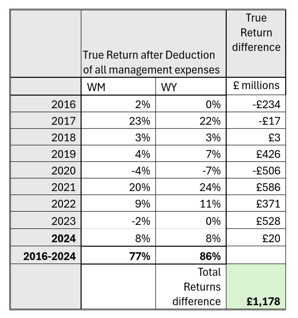 That's bad enough, but over the same period the WMPF perfectly legally deducted from the fund and handed over £1 billion in management expenses.
