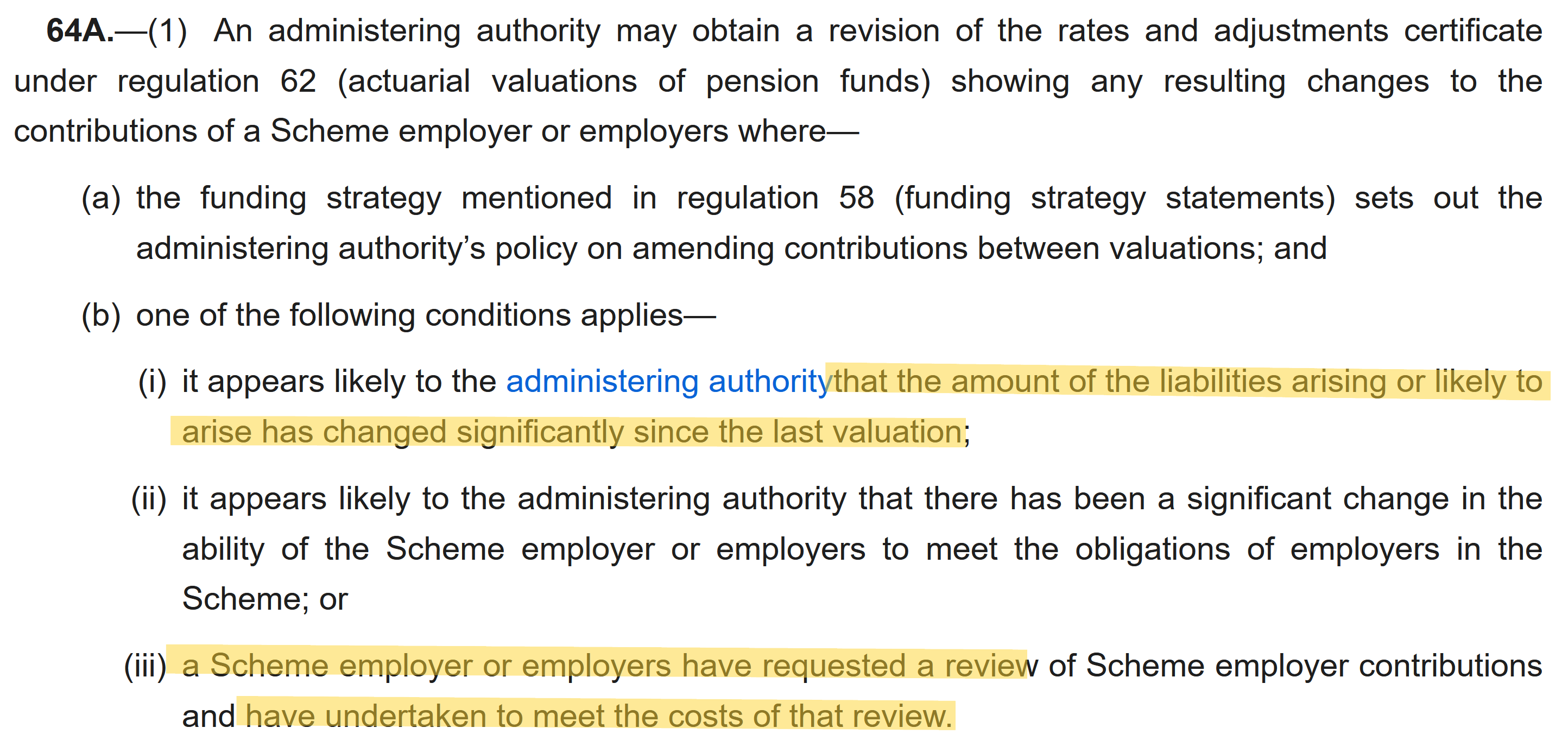 It seems quite clear that circumstances exist to enable Reg.64A to be brought in operation. Birmingham city council needs to simply request a review and re-certification of the council's contributions. They might need to meet the costs, but it will be small-fry compared to the 100s of £millions to be gained.